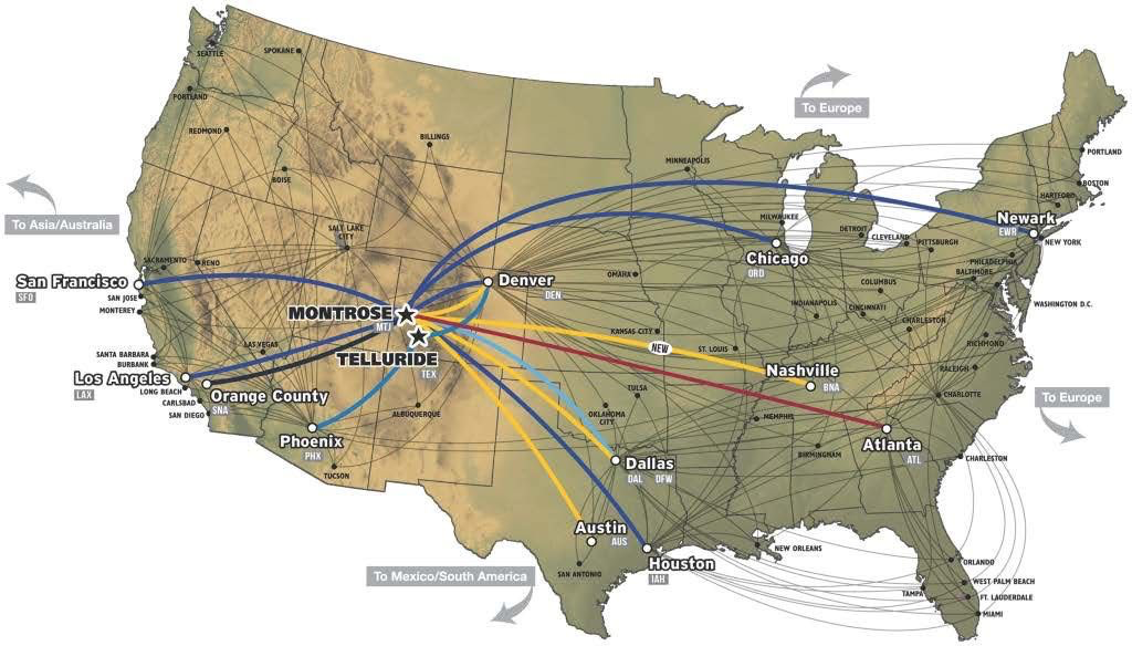Check out the direct flight map for Montrose (MTJ) and Telluride (TEX) airports from all over the country - some exciting new flights for the 2025/2026 winter season!